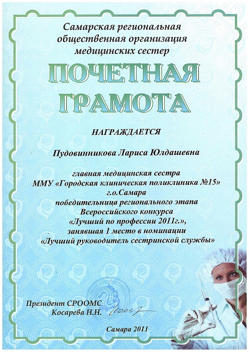 Почетная грамота победителя регионального этапа Всероссийского конкурса "Лучший по профессии 2011г." в номинации "Лучший руководитель сестринской службы"