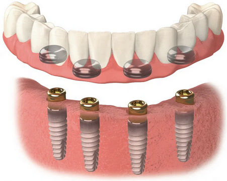 Протезирование на имплантах предполагает, что протезы крепятся не к натуральному зубу, а к искусственному «корню» – имплантату, который был вживлен в костную ткань челюсти вместо корней зуба. Имплантат не может самостоятельно держаться в лунке зуба, как это делает корень, поэтому он ввинчивается в костную ткань. Зубные импланты представляют собой штифты из титана. Данный металл полностью гипоаллергенен и биоинертен, поэтому штифт не отторгается и не вызывает аллергической реакции.
