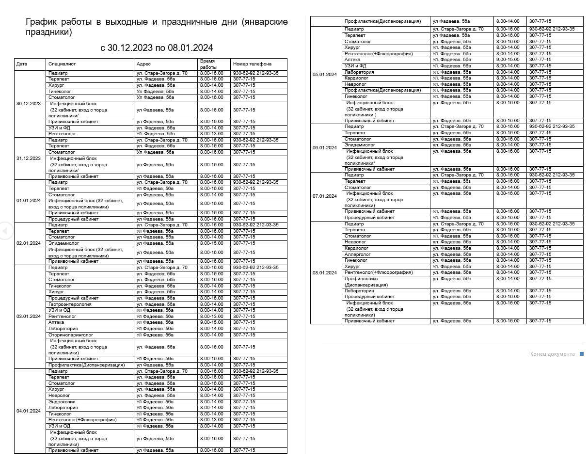 График работы в выходные и праздничные дни с 30.12.2023 по 08.01.2024