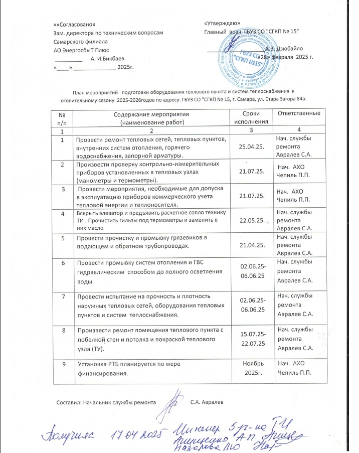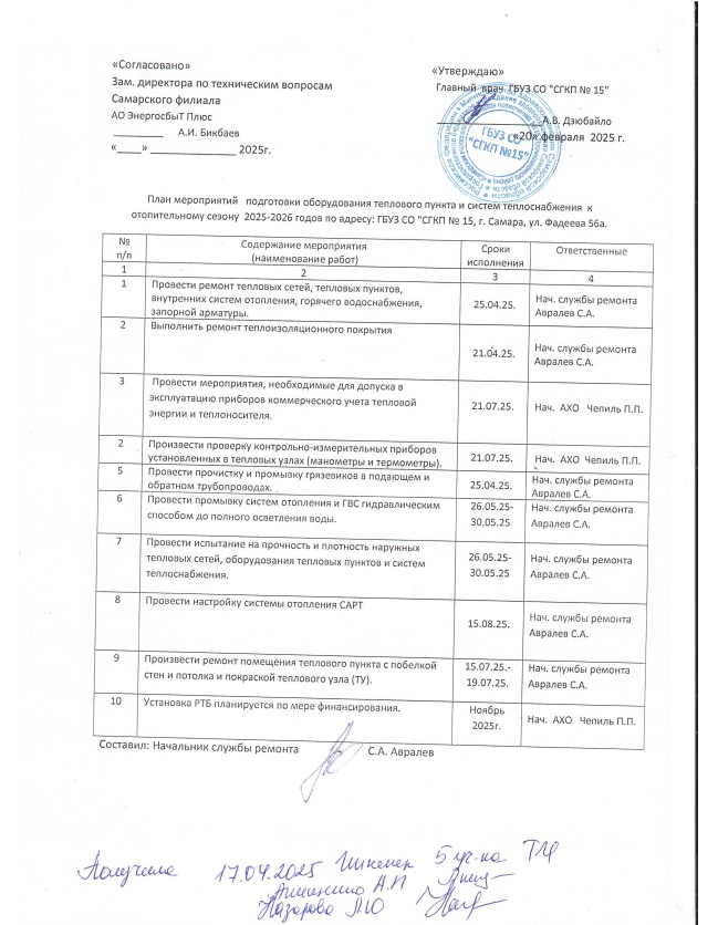 План мероприятий подготовки оборудования теплового пункта и систем теплоснабжения к отопительному сезону 2025-2026 годов