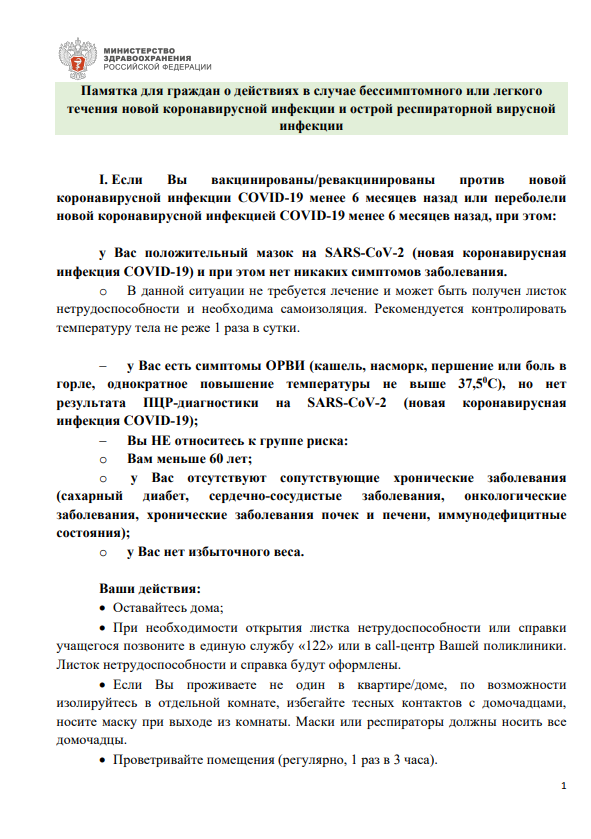 Минздрав России опубликовал памятку с рекомендациями по лечению при бессимптомном и легком течении заболевания коронавирусом и ОРВИ. Ведомство считает, что вакцинированным или ранее переболевшим COVID-19 при бессимптомной форме заболевания лечение не требуется. Таким людям рекомендовано уйти на самоизоляцию, они могут получить листок нетрудоспособности (больничный).